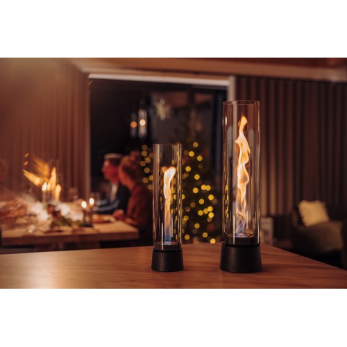 Bioetanoolil töötav kamin on suitsu- ja lõhnavaba ning sobib ideaalselt nii siseruumidesse kui ka rõdule. Kuumakindel borosilikaatklaasist silinder muudab leegi dünaamiliseks ja hästi nähtavaks ka päevavalguses, luues efektse valguse ja soojuse mängu.