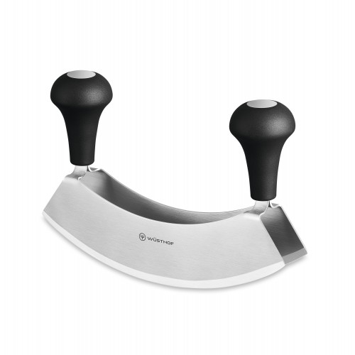 - Kasutamine: Kasutage nuga kerge kiigutava liigutusega puidust või plastikust lõikelaual. Kahekordne tera muudab hakkimise poole kiiremaks ja tulemuse ühtlasemaks.